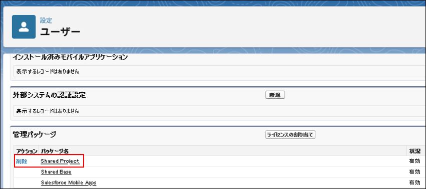 ③ユーザーの 「管理パッケージ」 から 「Shared Project」 の 「削除」 ボタンをクリックします。