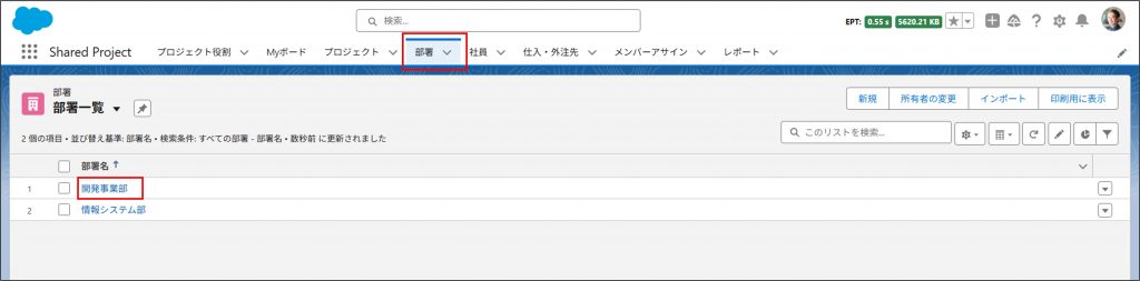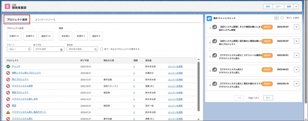 ②「プロジェクト進捗」 タブに部署が主管部署となっているプロジェクトの一覧が表示されます。
