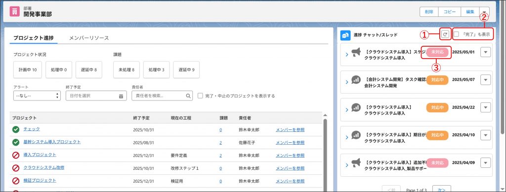 ②「部署」 画面右にある 「進捗チャット/スレッド」にてアラートを確認できます。