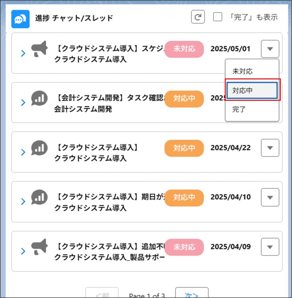 「▼」ボタンで状況を変更できます。(未対応、対応中、完了)