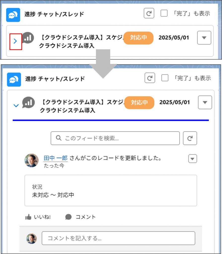 ③Myボードの進捗 チャット/スレッドに登録されたアラートの状況ステータスを 【▼】 ボタンを押して 「対応中」 に変更します。