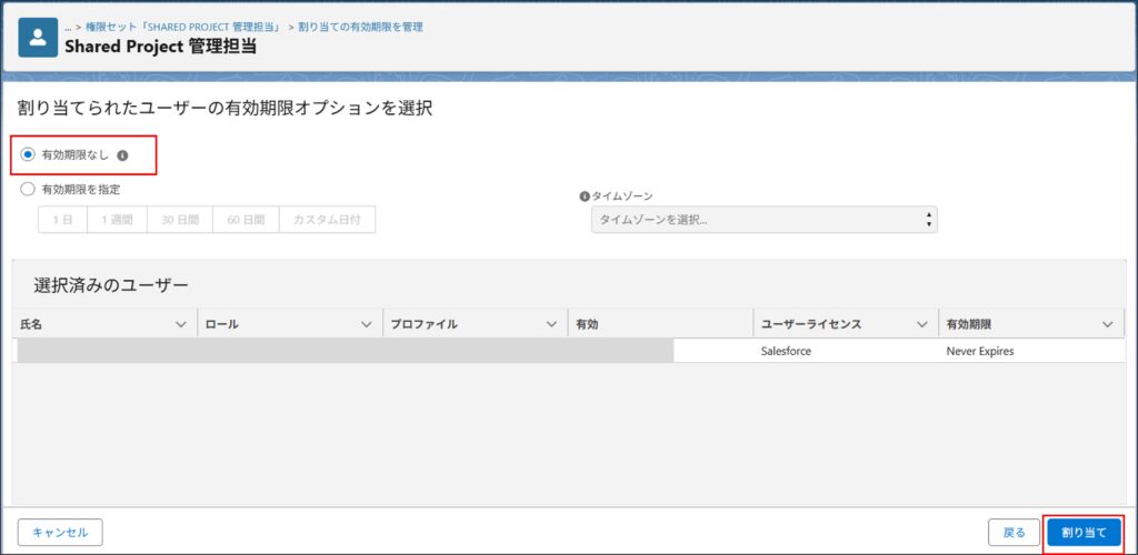 ⑥割り当てられたユーザーの有効期限オプション画面で「有効期限なし」を選択し、「割り当て」を選択します。