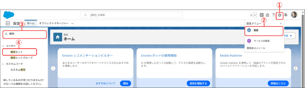 ①歯車アイコン>設定>クリック検索ボックスに「権限」と入力し、「権限セット」をクリックします。