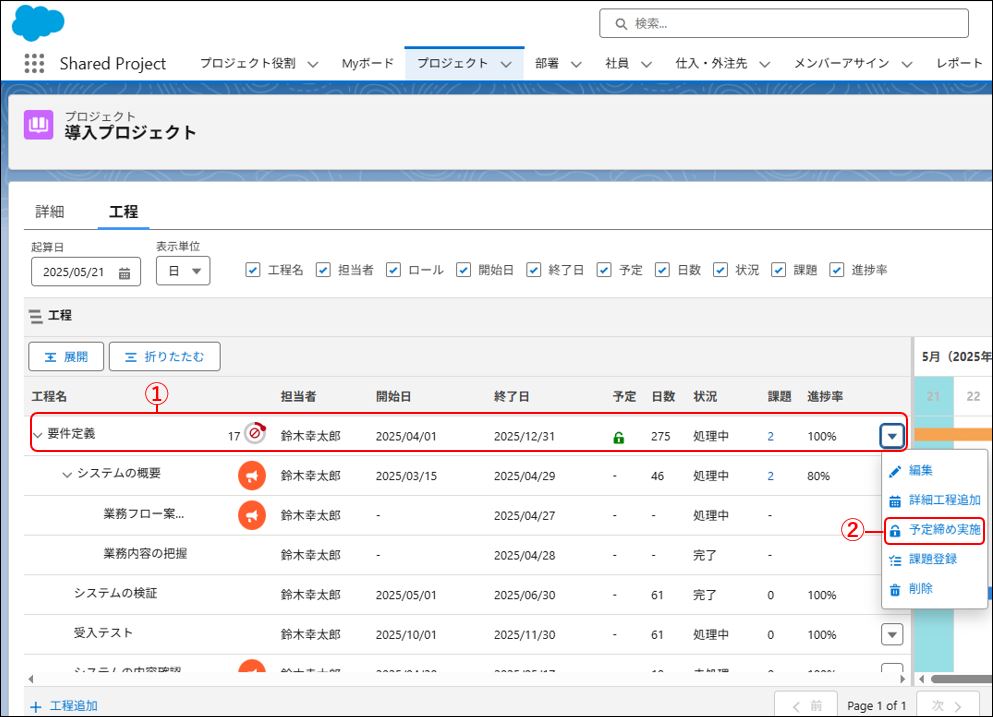 本ページでは、プロジェクトの予定を締める方法を説明します。
