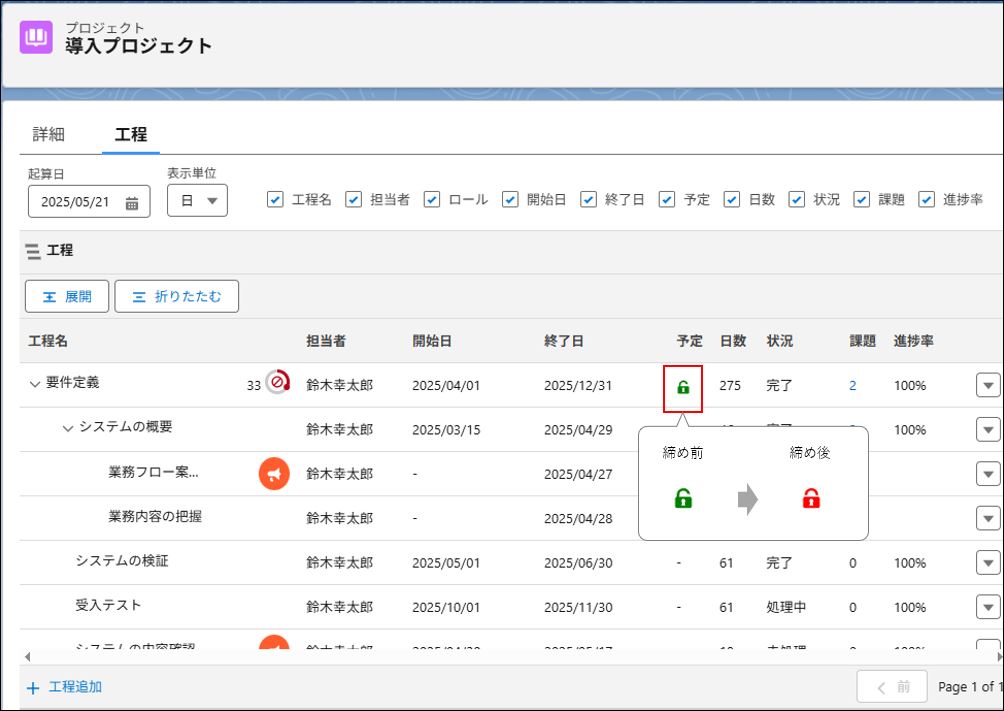 プロジェクト管理者が、プロジェクト画面にてプロジェクトの予定を締めることができます。