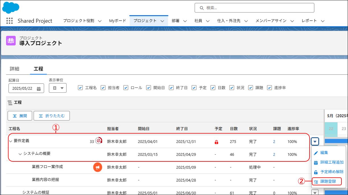②工程又は詳細工程の【▼】>「課題を登録」をクリックします。