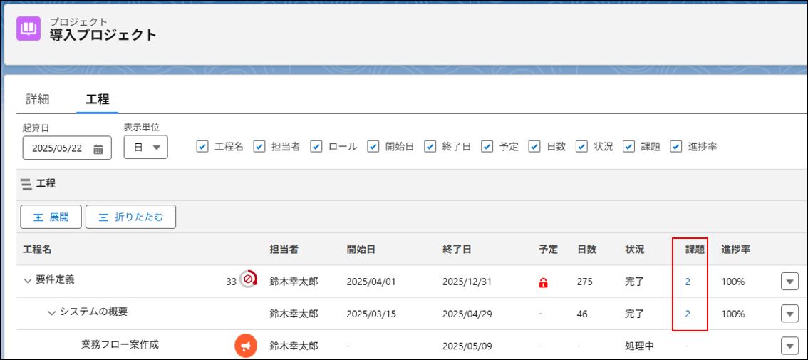 ④工程又は詳細工程の課題の「数字」の箇所をクリックします。